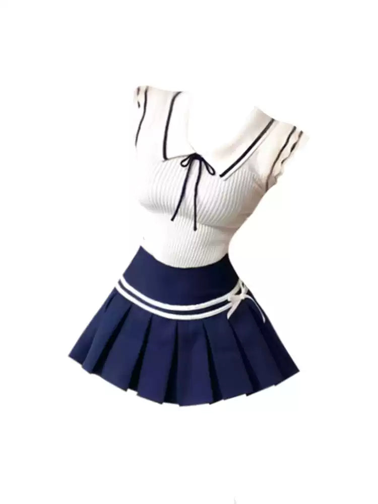 เซ็ตเสื้อไหมพรมแขนตุ๊กตากับกระโปรงจีบสไตล์นักเรียน