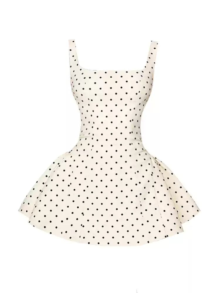 เดรสสายเดี่ยวลายจุด สุดน่ารัก เอวเข้ารูป กระโปรงเอไลน์ฟู ดูสดใสหวานสไตล์ไอดอล