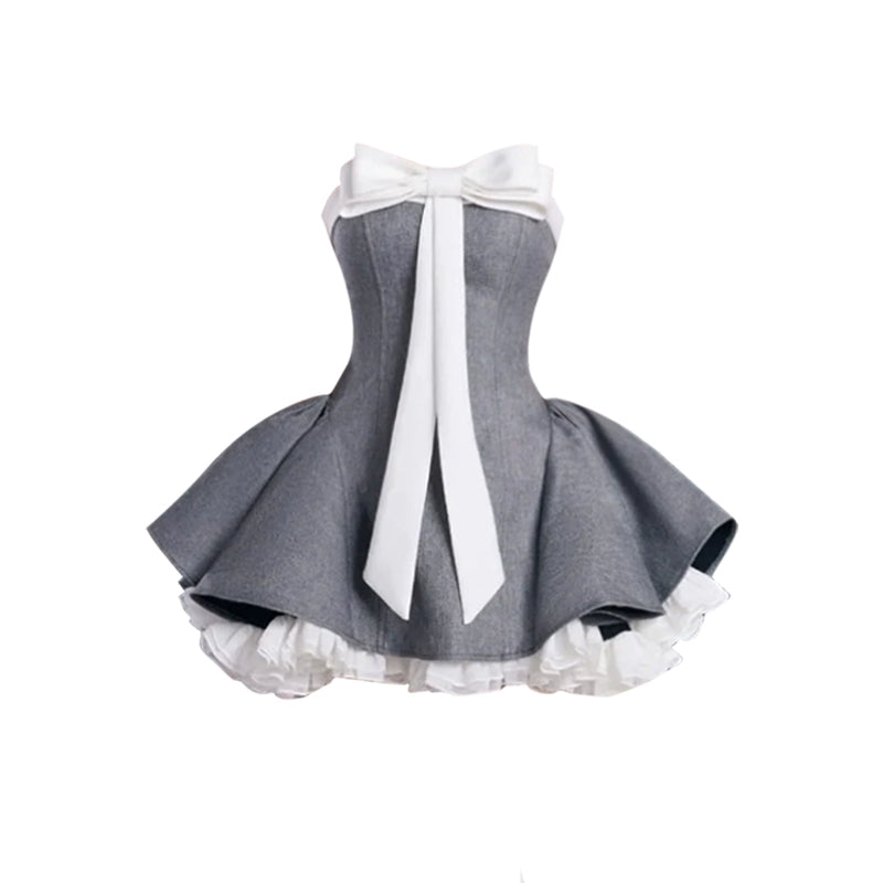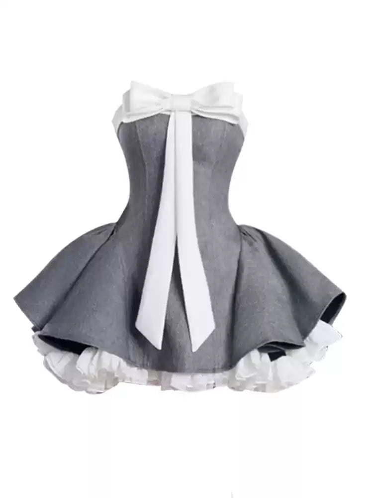 เดรสเกาะอกโบว์บัลเล่ต์เอวเข้ารูปกระโปรงสั้นฟูฟ่อง